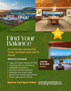 This special retreat will include daily yoga, chanting, medtation, and more! We will be staying in the Poipu area and have access to a swimming pool, hot tub at the beautiful villa. Please email me susan@susanjames.me if you are interested! Space is limited, and many are expressing interest!